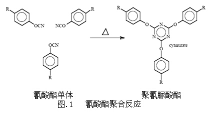 氰酸酯樹脂的種類很多,不同的結構會有不同的性能,但它們都固化聚合后生成三嗪環結構為主的網狀高聚物(見圖1)。